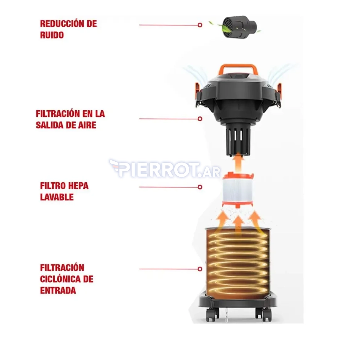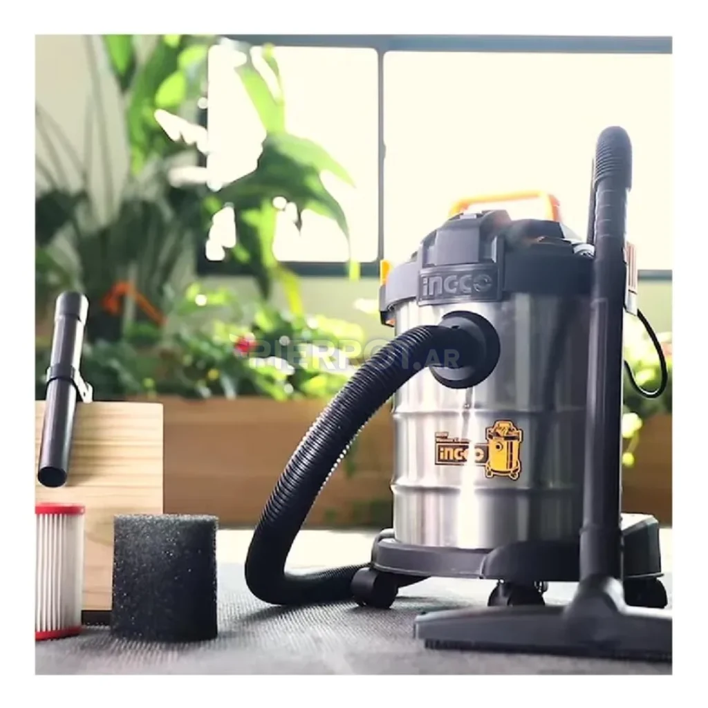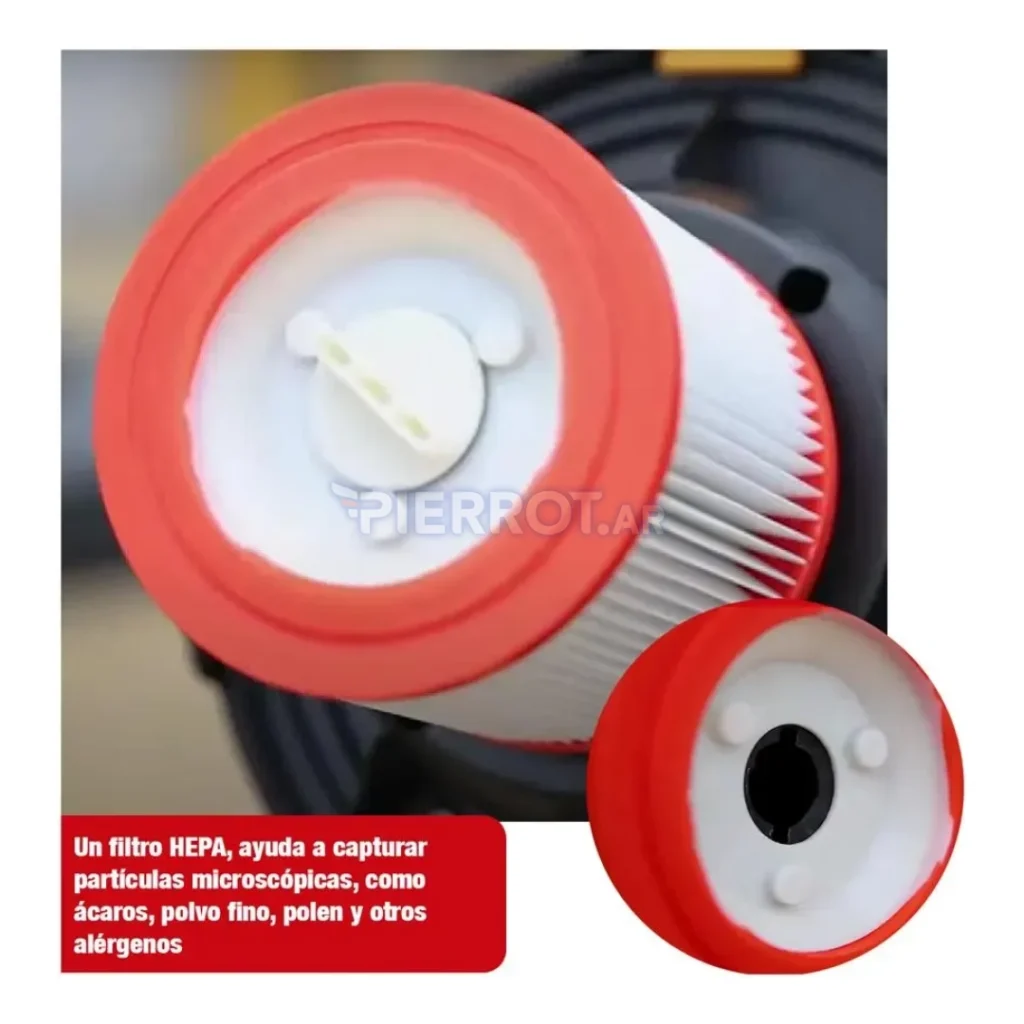 Esta aspiradora brinda potencia y versatilidad para aspirar polvo, residuos líquidos, serrín y suciedad de pisos, alfombras y rincones difíciles. Su tanque metálico de 12 L permite sesiones prolongadas sin vaciados frecuentes. El filtro HEPA asegura un ambiente más limpio al retener alérgenos y polvo fino, ideal para hogares con mascotas o personas sensibles. El conjunto de accesorios facilita el paso de limpieza general a limpiezas más técnicas sin necesidad de herramientas adicionales.