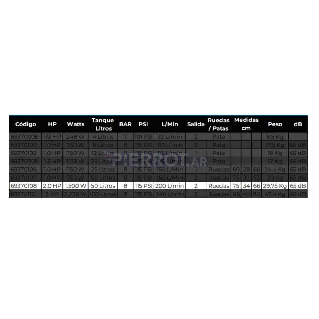 Este compresor no solo es potente, sino que también es increíblemente versátil. Ideal para inflar neumáticos, operar herramientas neumáticas, y realizar tareas de pintura, su diseño de compresor seco significa que no tendrás que preocuparte por el mantenimiento frecuente, permitiéndote concentrarte en lo que realmente importa: terminar tus proyectos con resultados profesionales. Su capacidad de 50 litros asegura que puedas trabajar por más tiempo sin interrupciones, mientras que las dos salidas de aire te ofrecen la flexibilidad de usar varias herramientas al mismo tiempo.