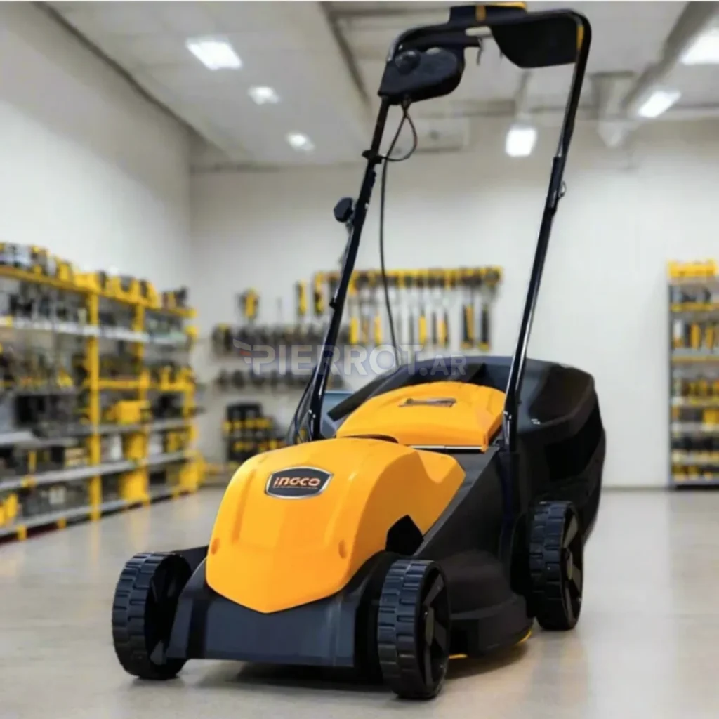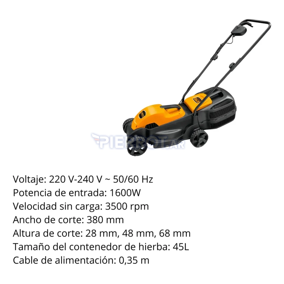 Additional Info – Especificaciones: Voltaje 220–240 V ~ 50/60 Hz; Potencia 1600 W; Velocidad 3500 rpm; Ancho de corte 380 mm; Alturas 28/48/68 mm; Contenedor 45 L; Cable 0,35 m. Recomendaciones de cuidado: desconectar antes de cualquier mantenimiento, vaciar el recogedor después de cada uso, limpiar el chasis y la carcasa de restos de hierba y verificar periódicamente el estado de las escobillas de carbón. Almacenar en lugar seco y protegido. La cortadora Ingco le ofrece la potencia y la flexibilidad necesarias para un césped perfecto con mínimo esfuerzo.