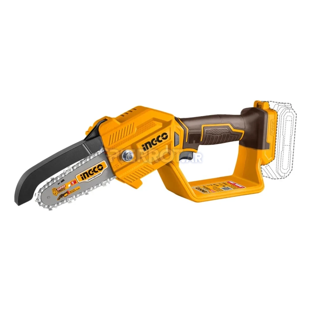 Mini Motosierra a Batería 5'' 20 V — Potencia compacta para poda y trabajos precisos. Diseñada para quienes buscan una herramienta ligera y manejable sin sacrificar rendimiento, la Mini Motosierra INGCO 20 V con espada de 5" (13 cm) facilita cortar ramas, arbustos y piezas de madera de pequeño a mediano tamaño con rapidez y seguridad.