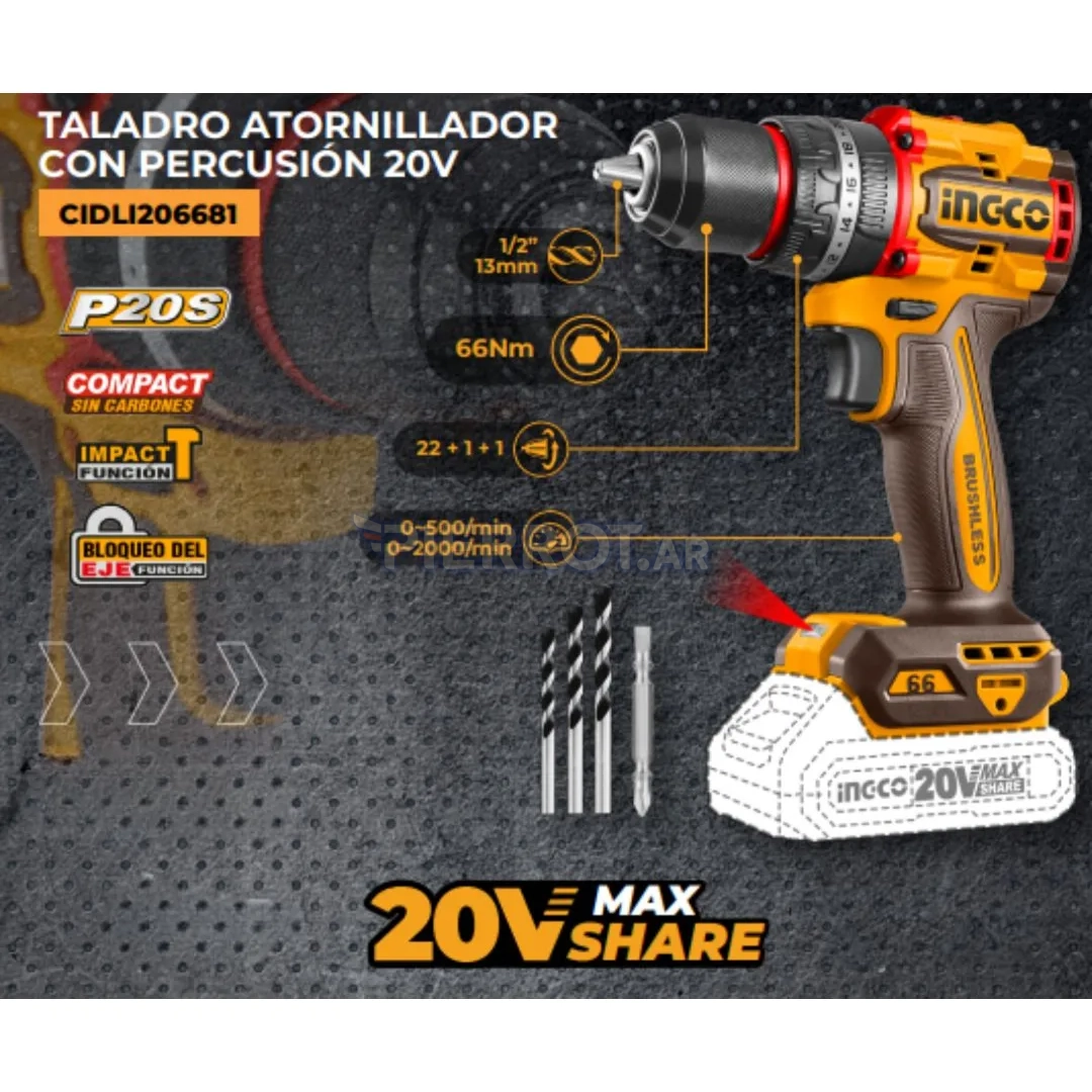 Descubre el poder y la eficiencia del "Taladro Percutor 20 V 13 mm – Sin Carbones" de la reconocida marca Ingco, diseñado para elevar tus proyectos a un nuevo estándar de profesionalismo y precisión. Esta herramienta de vanguardia es imprescindible para quienes buscan resultados impecables en cada tarea de perforación y atornillado.