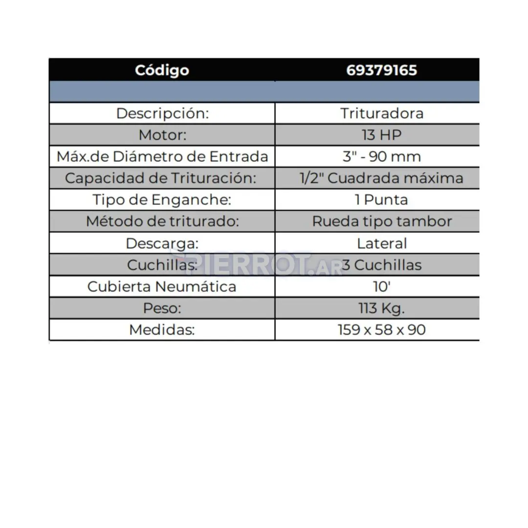 Fabricada con materiales de alta calidad, esta trituradora es resistente a las condiciones climáticas y al desgaste, asegurando un rendimiento confiable año tras año. Con un peso de 113 kg y medidas de 159 x 58 x 90 cm, es una máquina sólida pero manejable, diseñada para ofrecer la máxima eficiencia sin comprometer la movilidad.